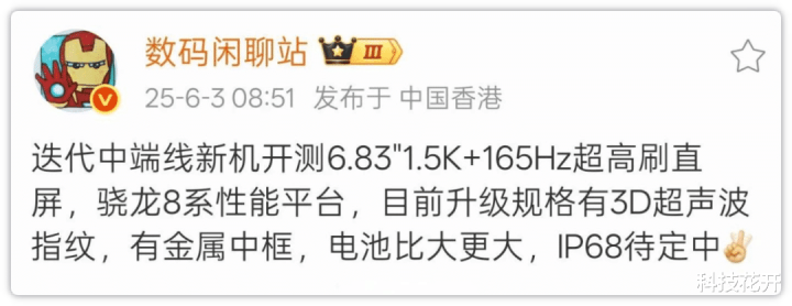 爆料达人数码闲聊站透露:迭代中端线新机开测6.83英寸1.5K分辨率+165Hz超高刷直屏,骁龙8系性能平台……